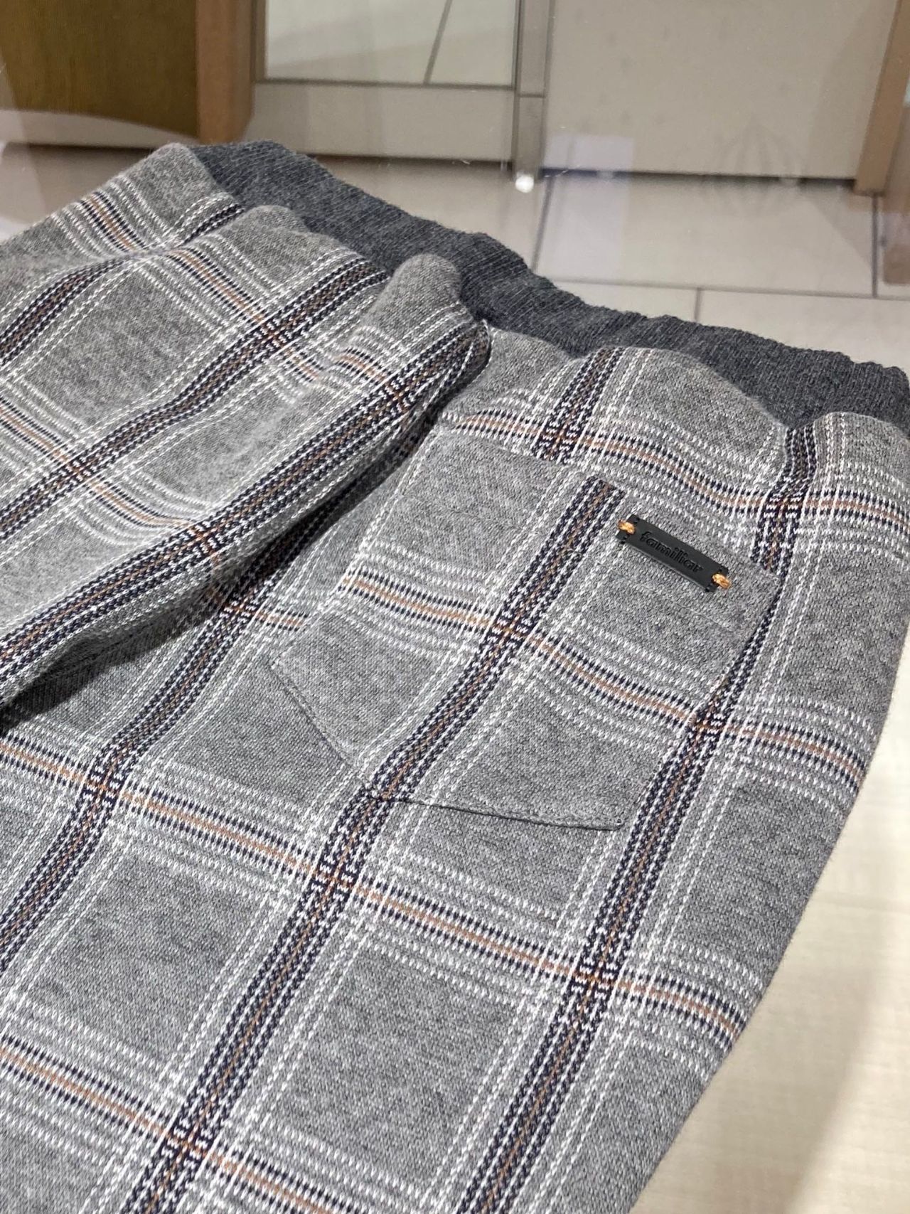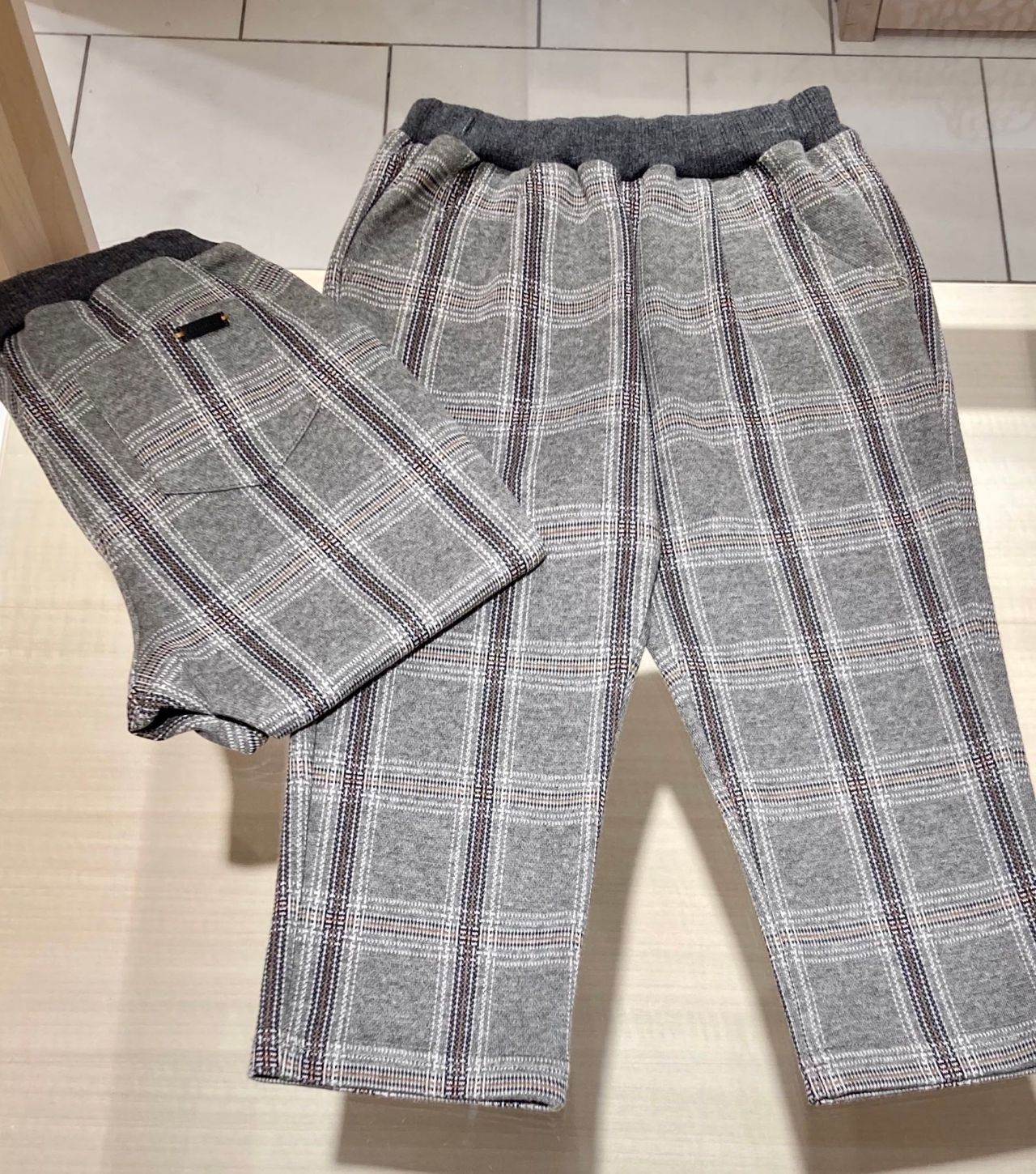 グレーベースの落ち着いたチェックのロングパンツです。