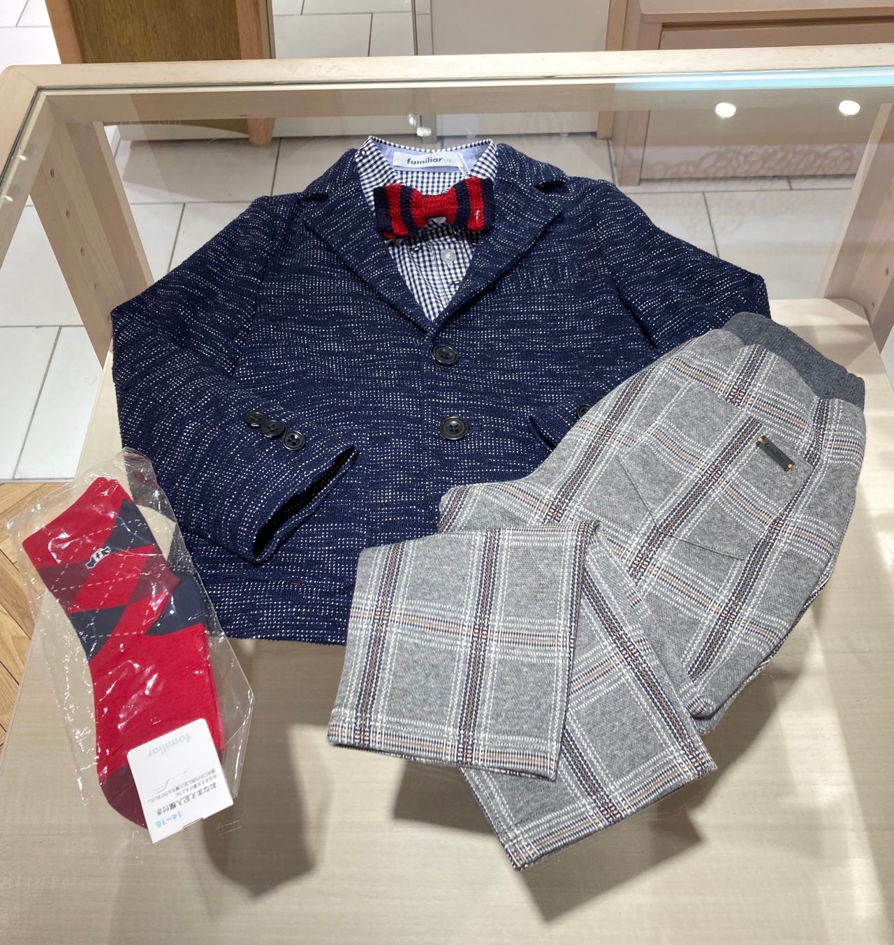 蝶ネクタイとソックスにレッドを持ってくることでぱっと目を引くポイントにしてみました。