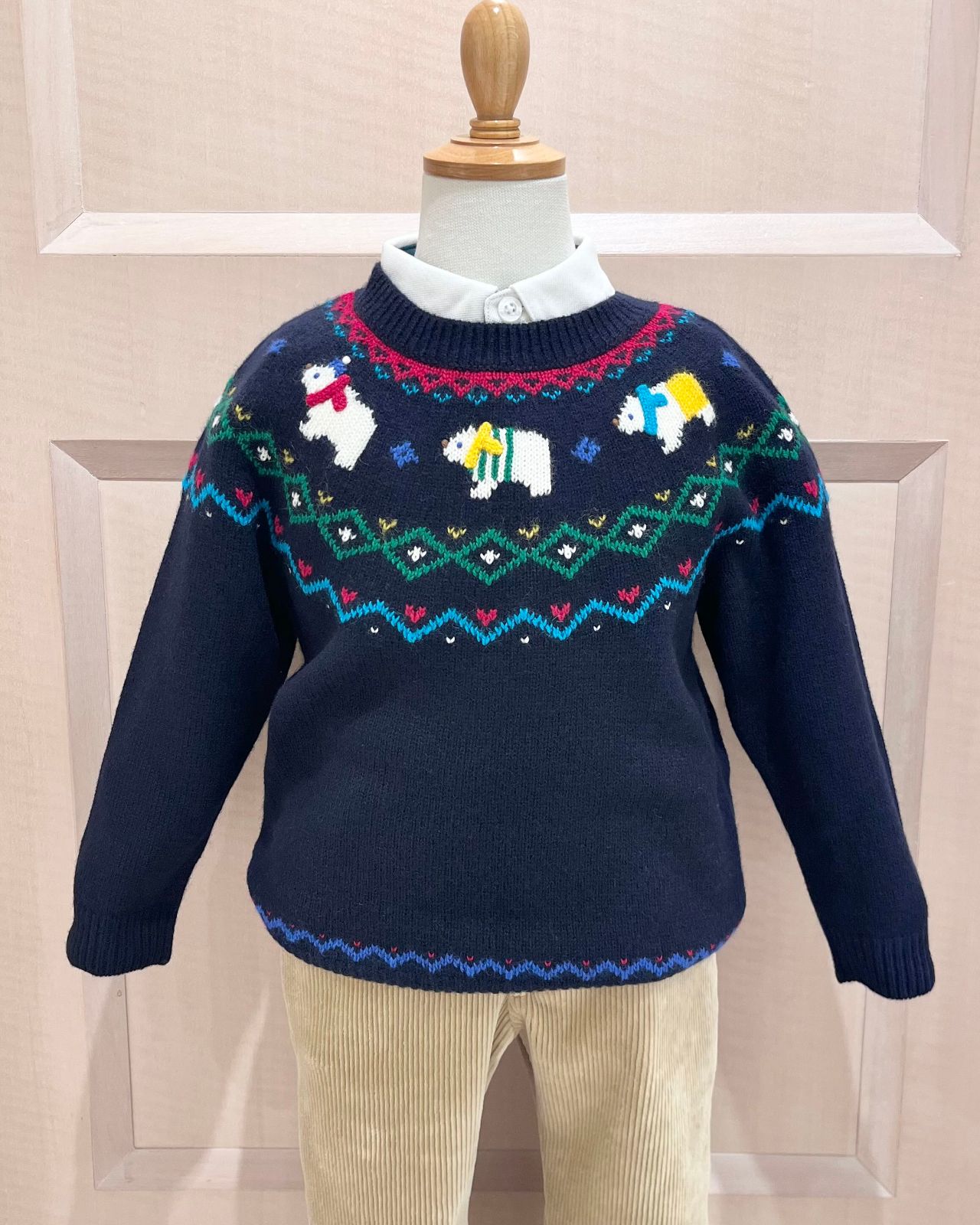 マフラーをしたり服を着ていたりする白クマがポイントのフェアアイルセーター♪