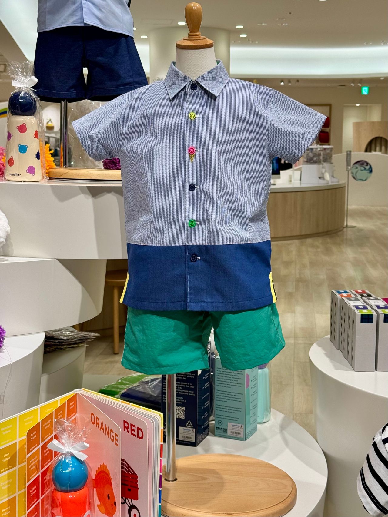 シンプルなシャツにカラフルなボタンと、裾の切り替えがおしゃれですね♪