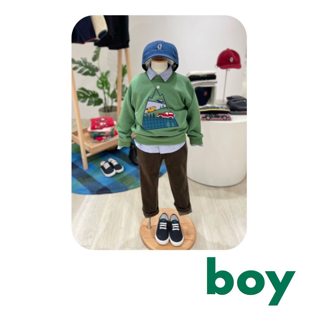 新作のグリーンのトレーナーにコーデュロイのパンツを合わせた秋らしいコーディネート。