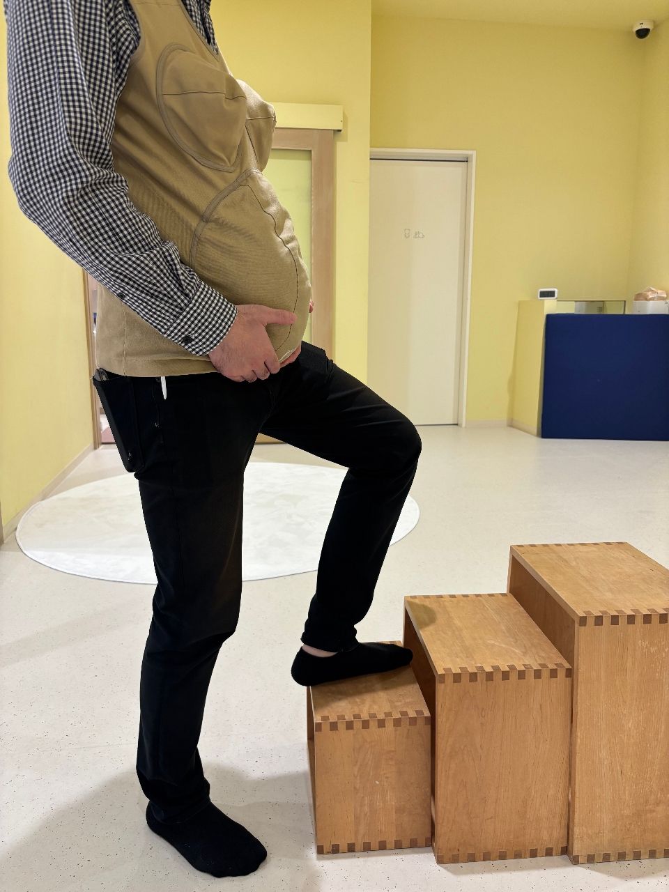 お話する内容はマタニティセミナーとほとんど同じですが、ペアレンツクラスではプレママ疑似体験をすることができます