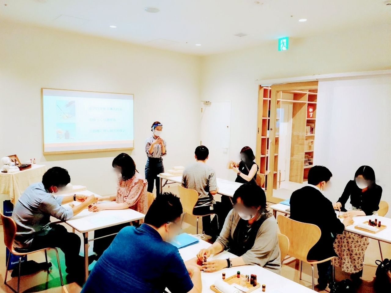 ご妊娠中でも安心してご使用いただける6種類の精油の中から好きな香りを選んでアロマオイルを作っていただきます。