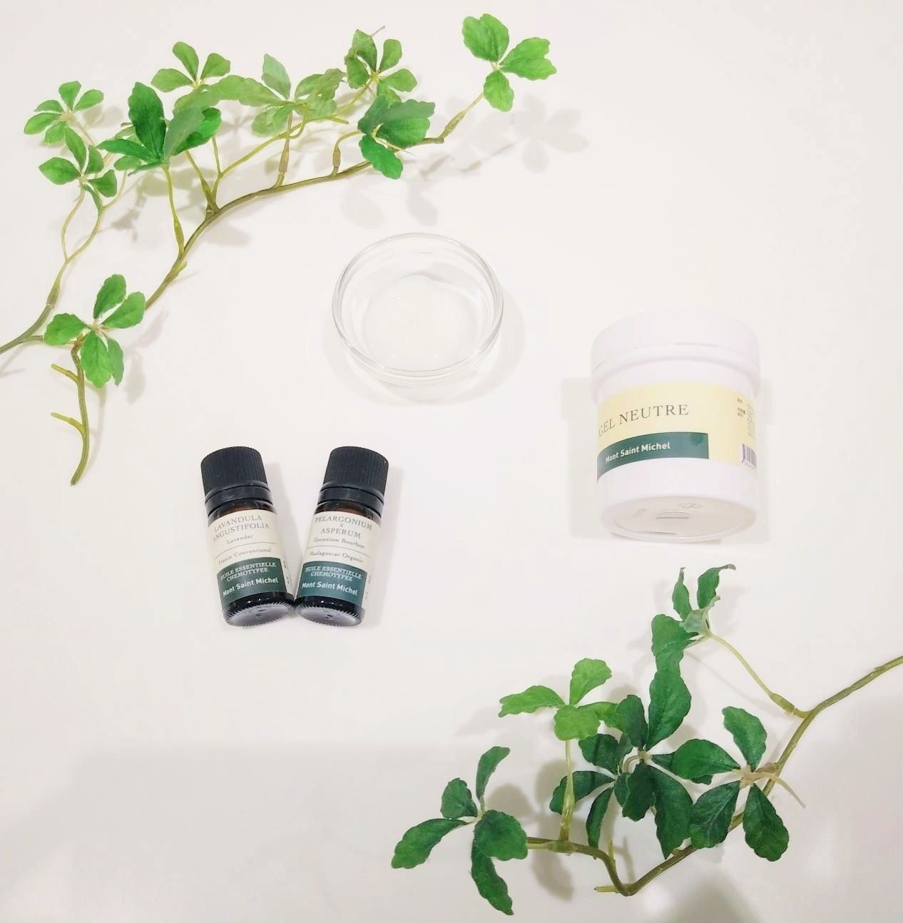 ジェルベース30mlにお好みの精油6滴を混ぜてからぬります。