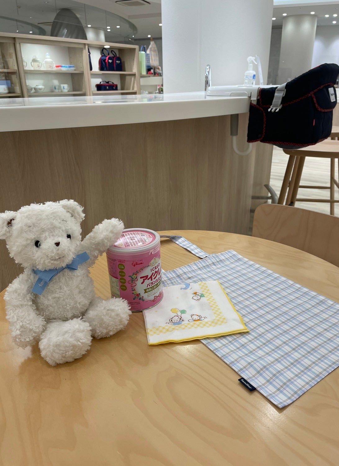 江崎グリコ様のアイクレオ粉ミルク缶と、ファミリア のガーゼハンカチを、オリジナルのバッグに入れてプレゼント。