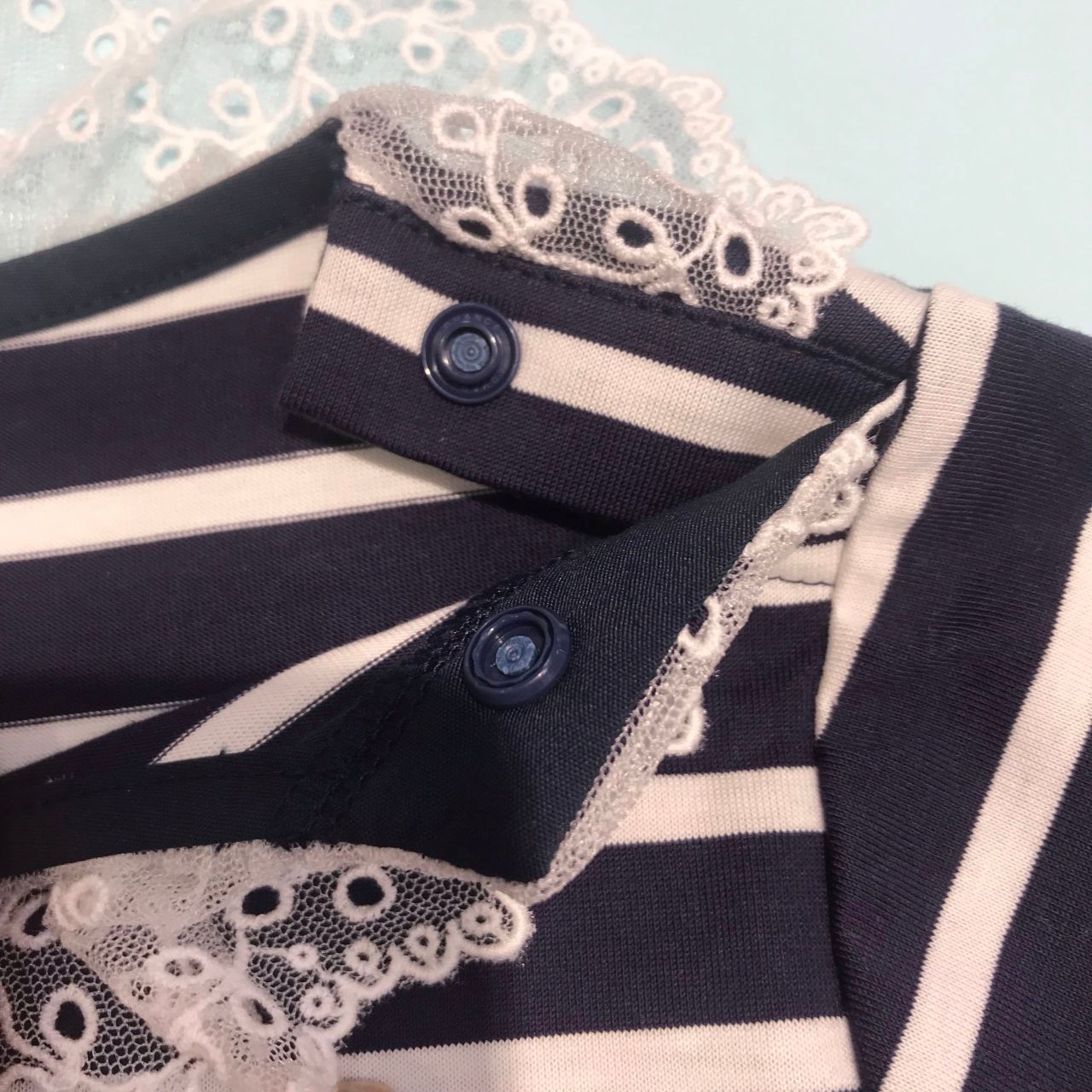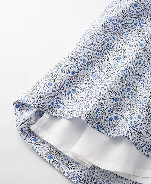 上身頃はスムース素材で動きやすく、衿には布帛のリバティの共地を使っておりますのできちんとした印象になりますね。