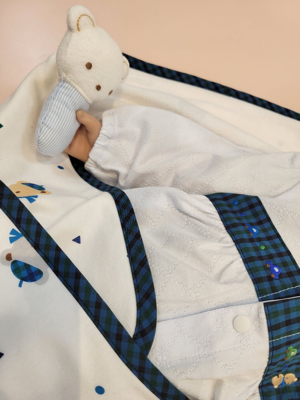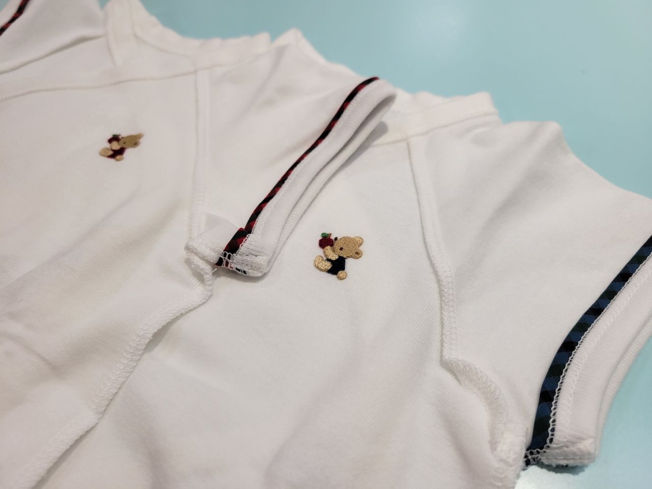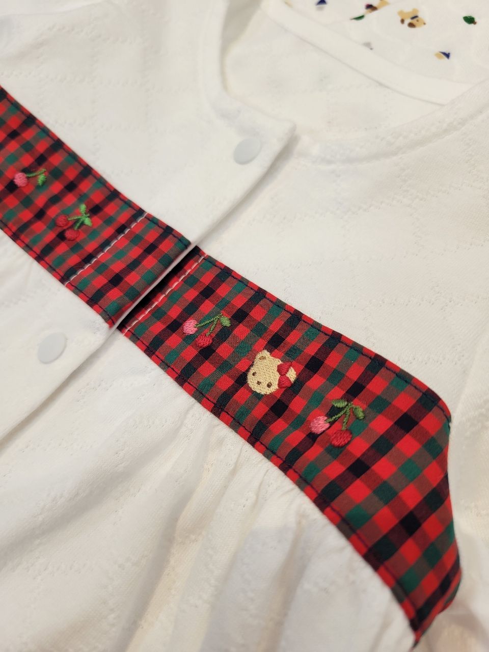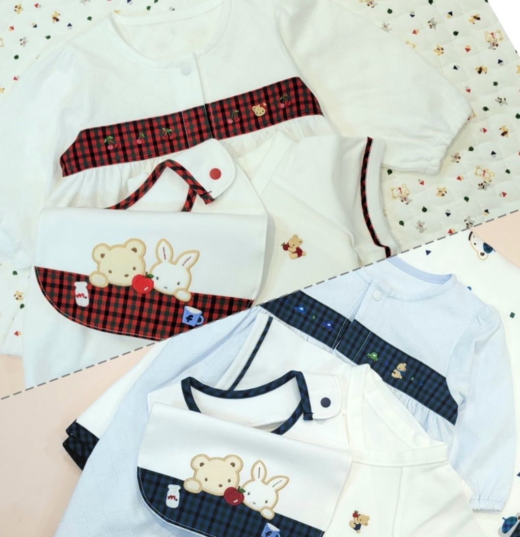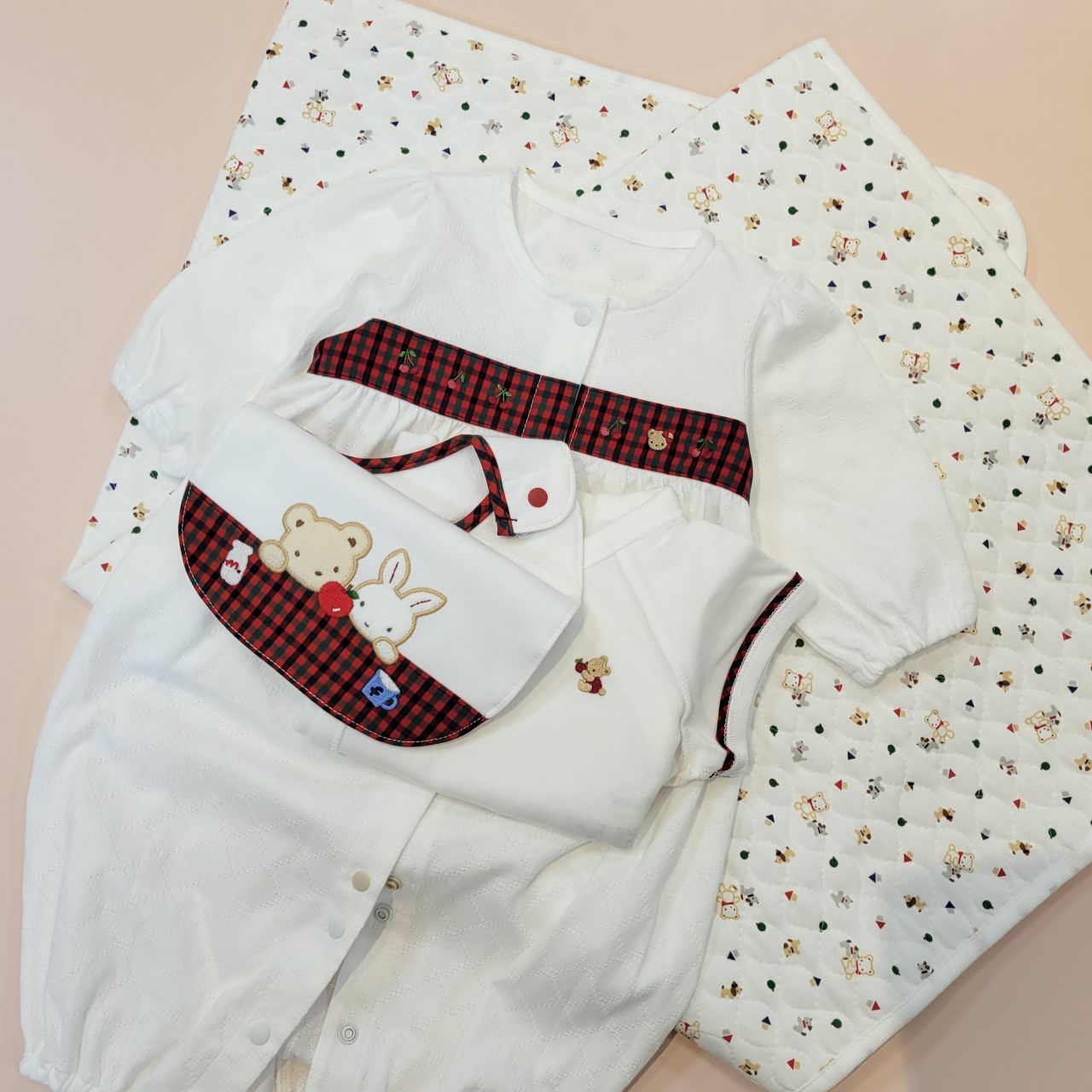 色違いで、赤チェックのウエアやお肌着、ヨダレかけもご用意しております。