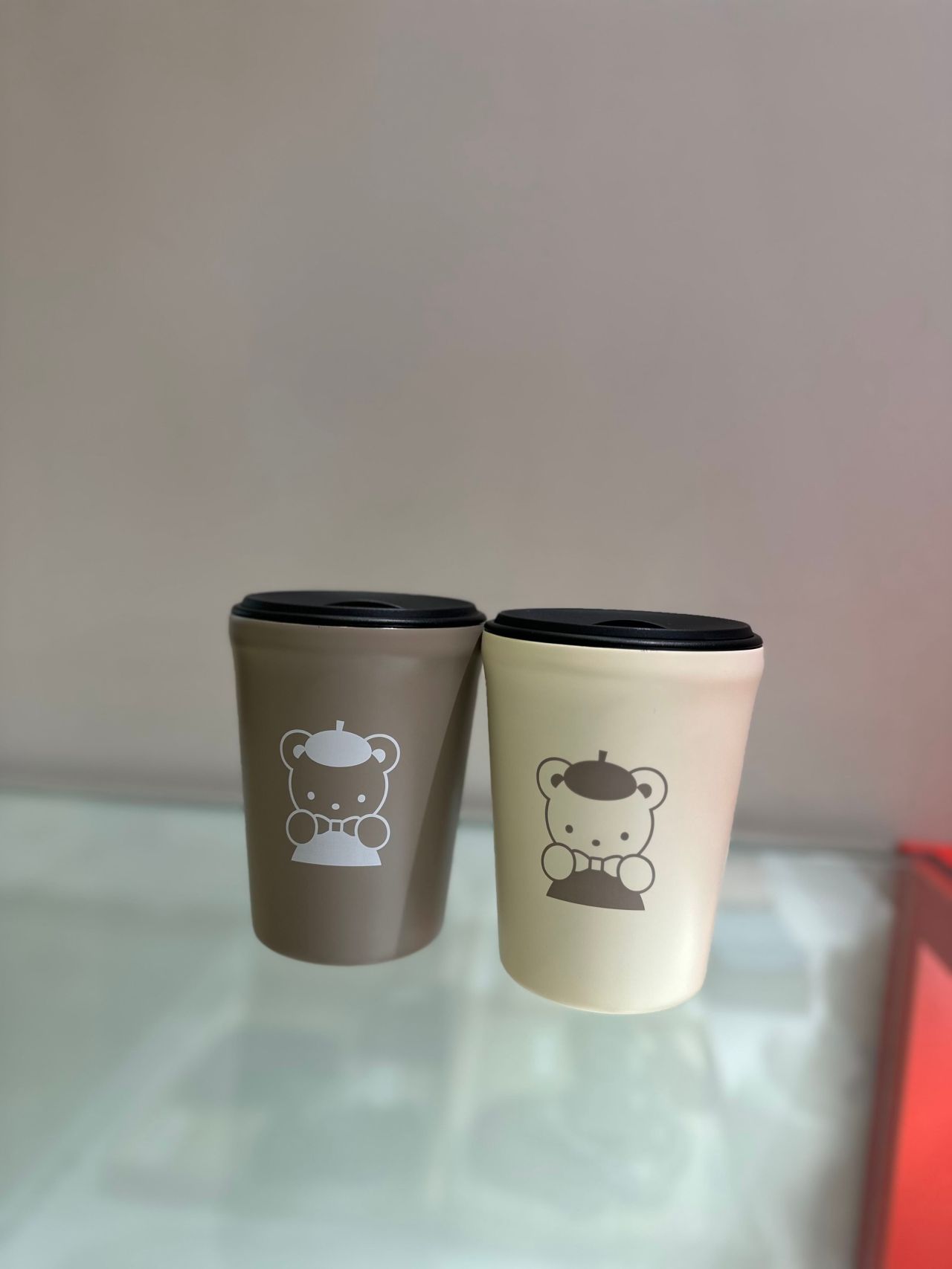 蓋付きタンブラーは、クマちゃんがプリントされた