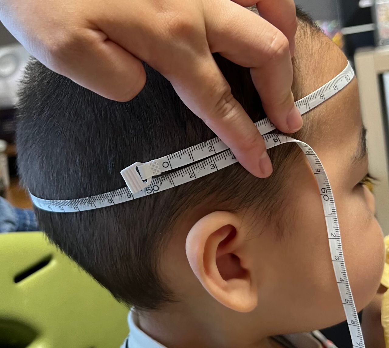 おでこの一番出っ張ってる部分からぐるっと一周はかります。