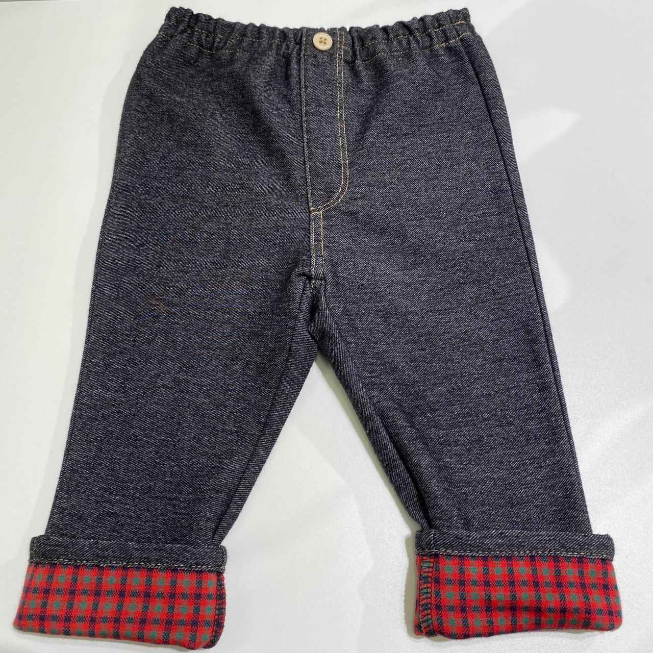 後ポケットのパイピングと裾裏の赤系チェックがアクセントになっています♪