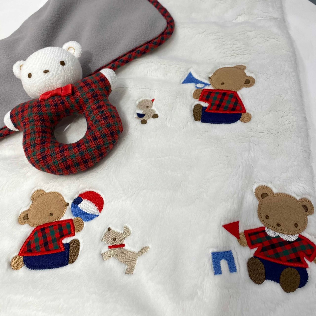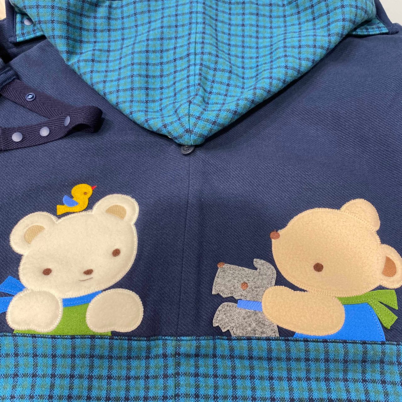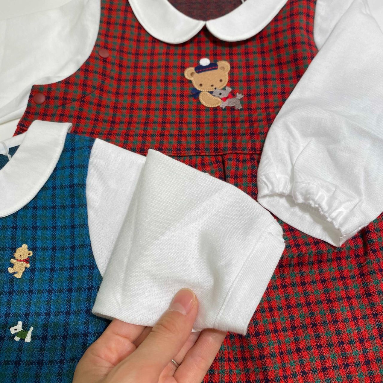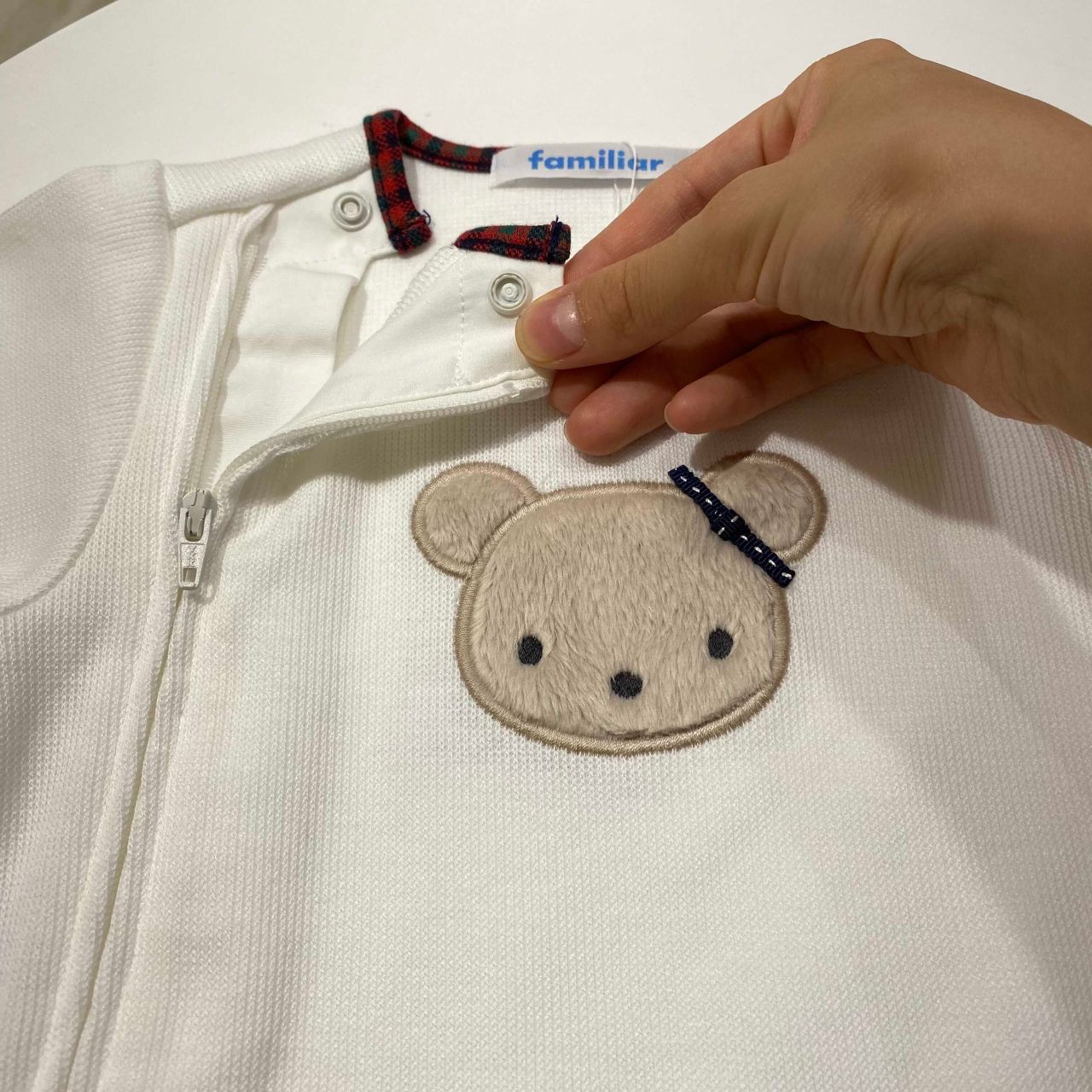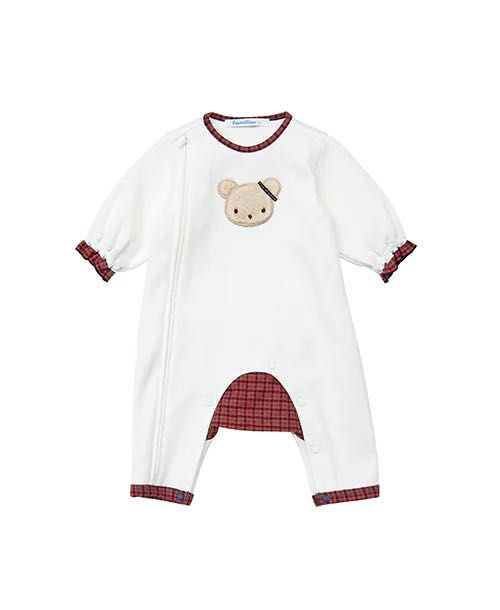 胸元のふわふわの立体的な くまさんモチーフや、衿ぐりや袖口、お尻のマチ部分にファミリアチェックを使用した可愛らしいデザインのロンパスです♪