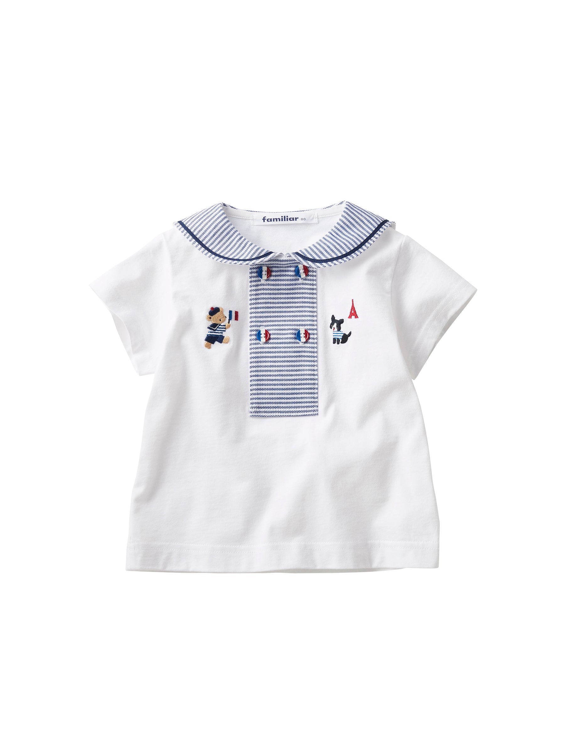 薄手の天竺ベースに、鹿の子ボーダーは前明きとセーラー襟に使用しています。フレンチマリンスタイルのくまちゃんとフレンチブルドックのワンポイント刺繍をほどこしました。