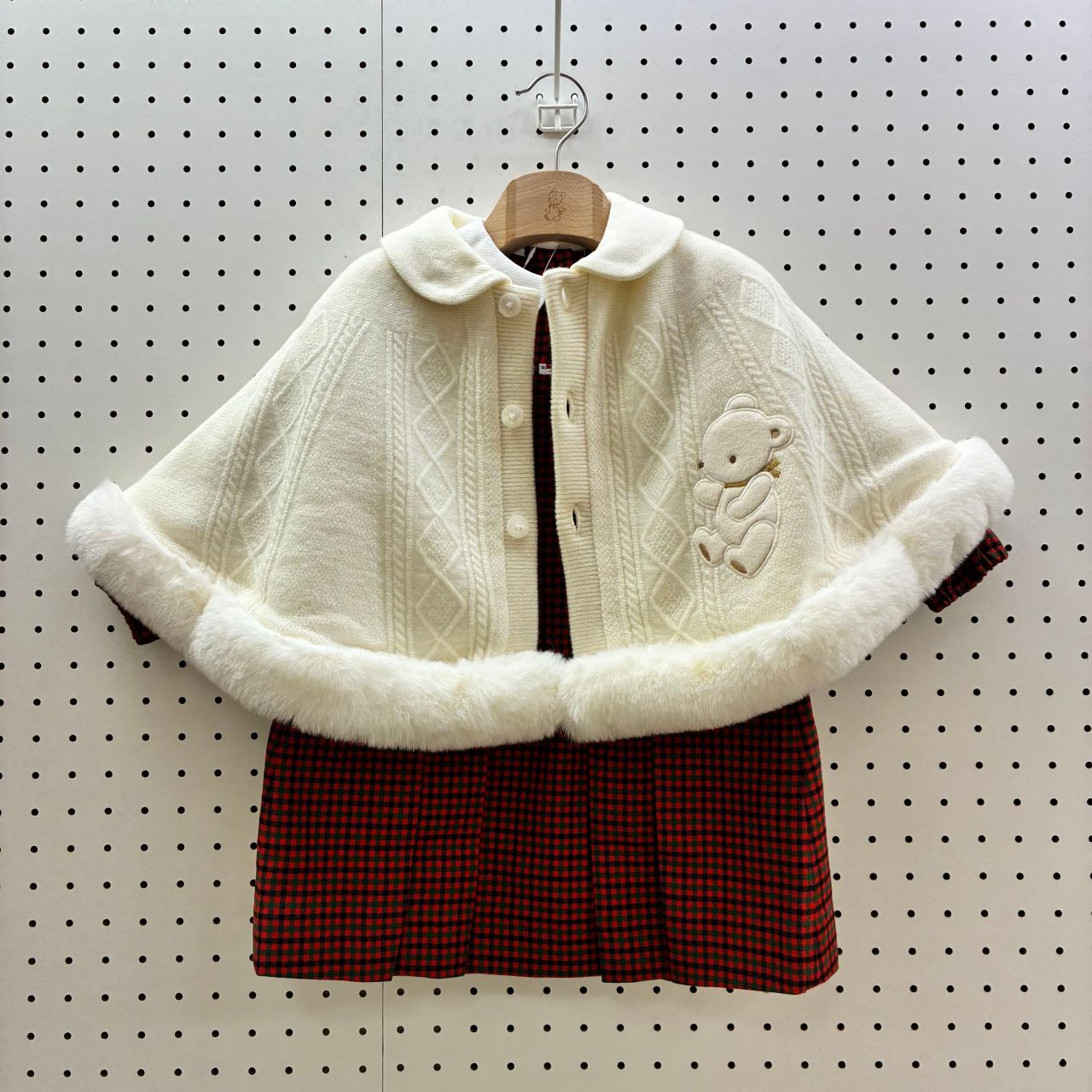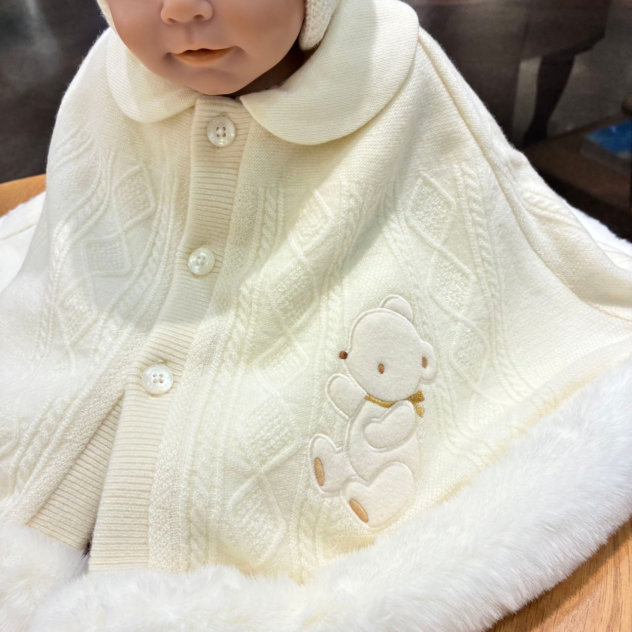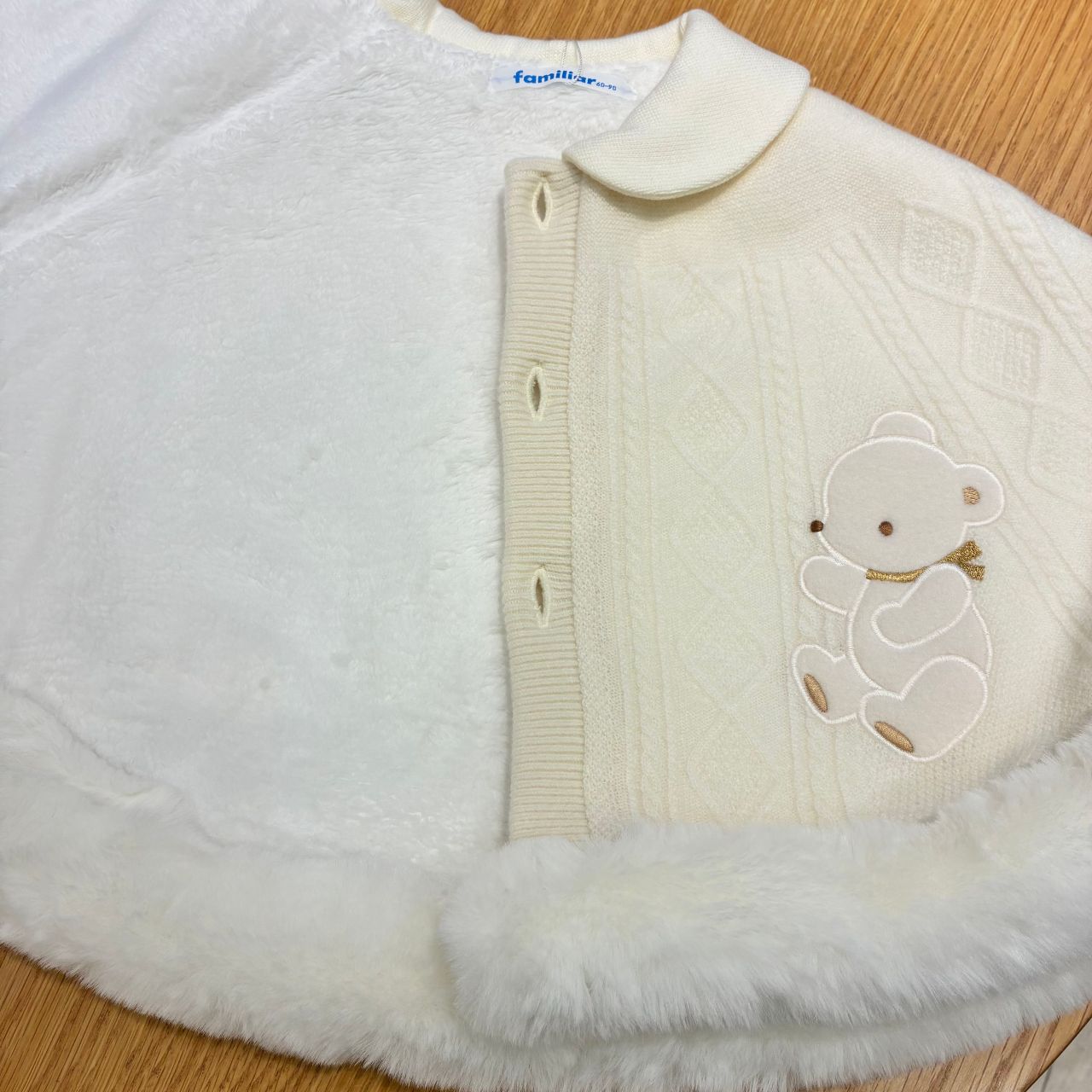 やさしいアイボリーの生地、裾には真っ白なファーで冬に映えるケープです✨