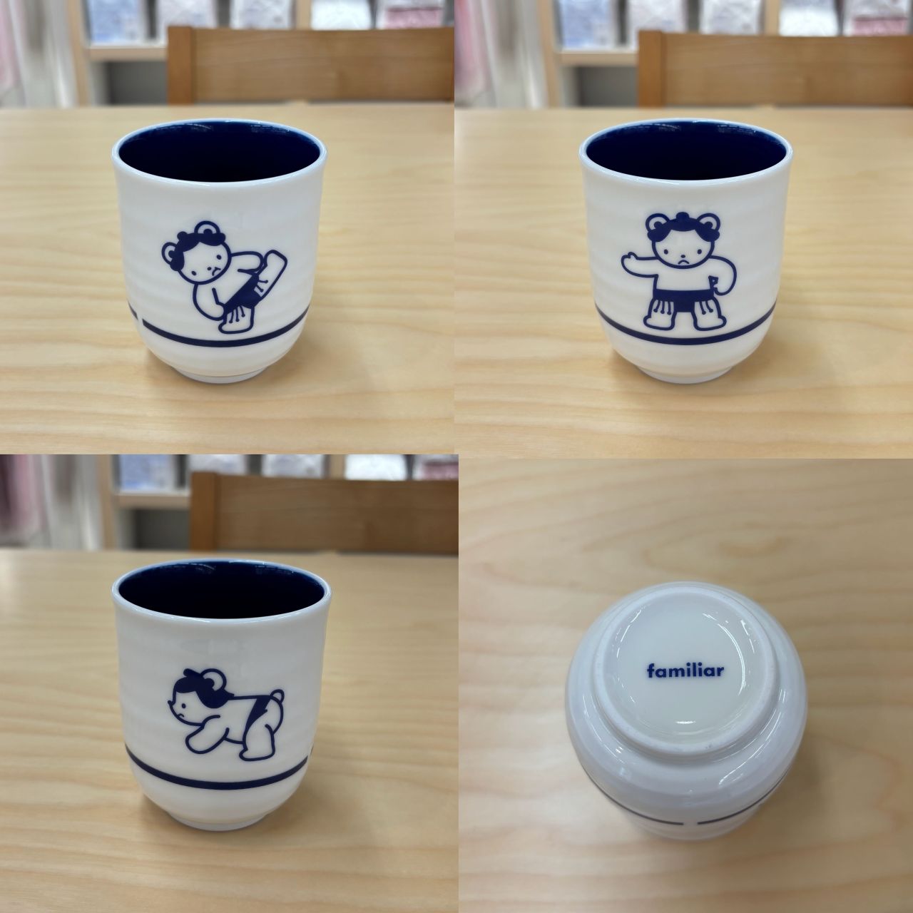 四股を踏んでいる姿や今にも取組を始めそうなクマちゃんの姿を描いた湯呑。