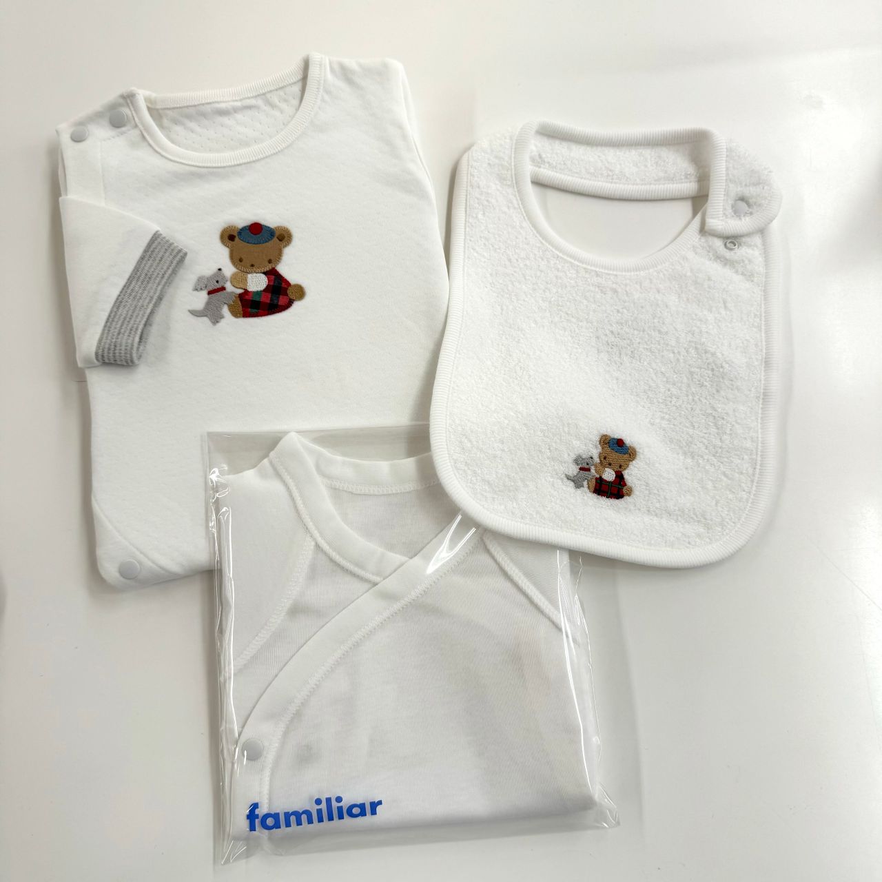胸元のクマちゃんの刺繍はファミリアチェック風♡