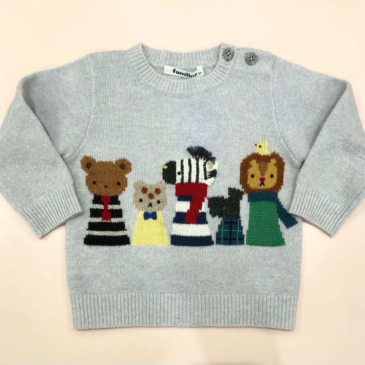 立体的に表現された、クマとアルパカのタートルネックセーターがポイントです♪