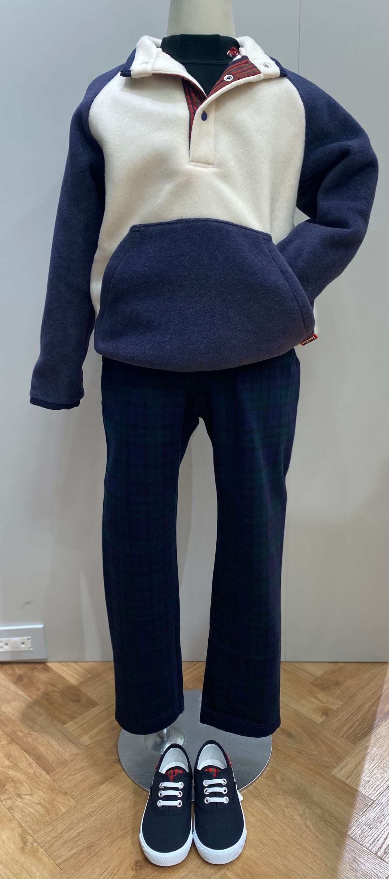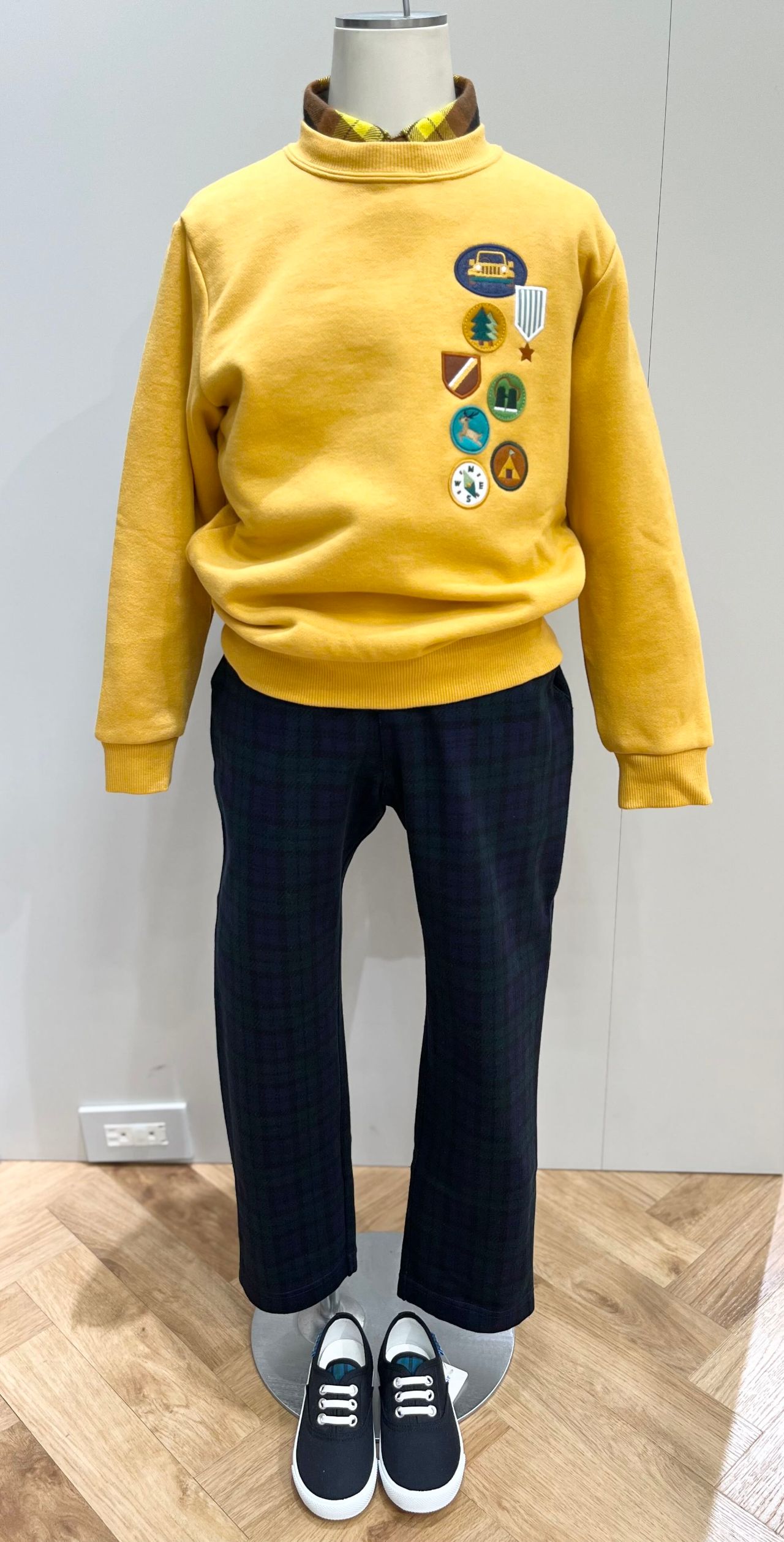 同じファミリアチェックがポイントのトレーナー(品番:346401)と合わせることでカジュアルでも統一感のあるスタイルになります。公園に行くときは汚れの付きにくいジャケット(品番:240358)を羽織るのがおすすめです。
